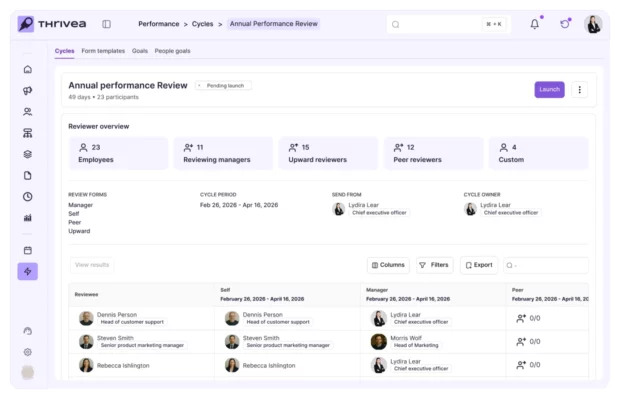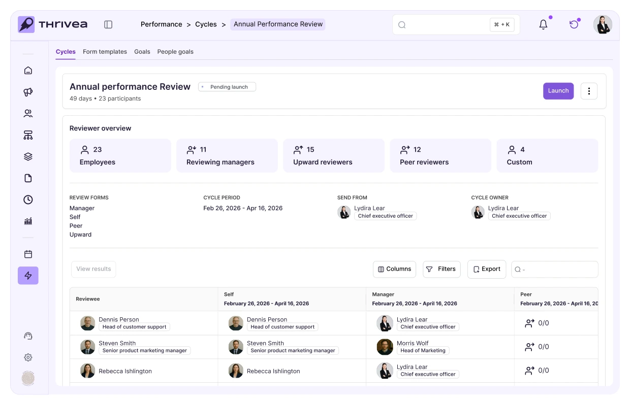 Schedule reviews by role, department, or custom group. Launch self, manager, peer, or 360 reviews with clear timelines, templates, and automated reminders.