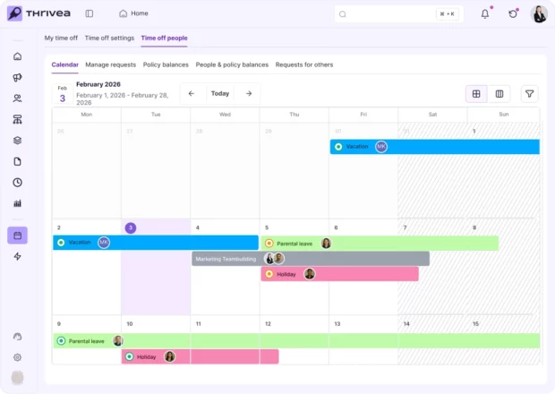See who’s off and when. The shared calendar helps teams plan better and avoid overlap.