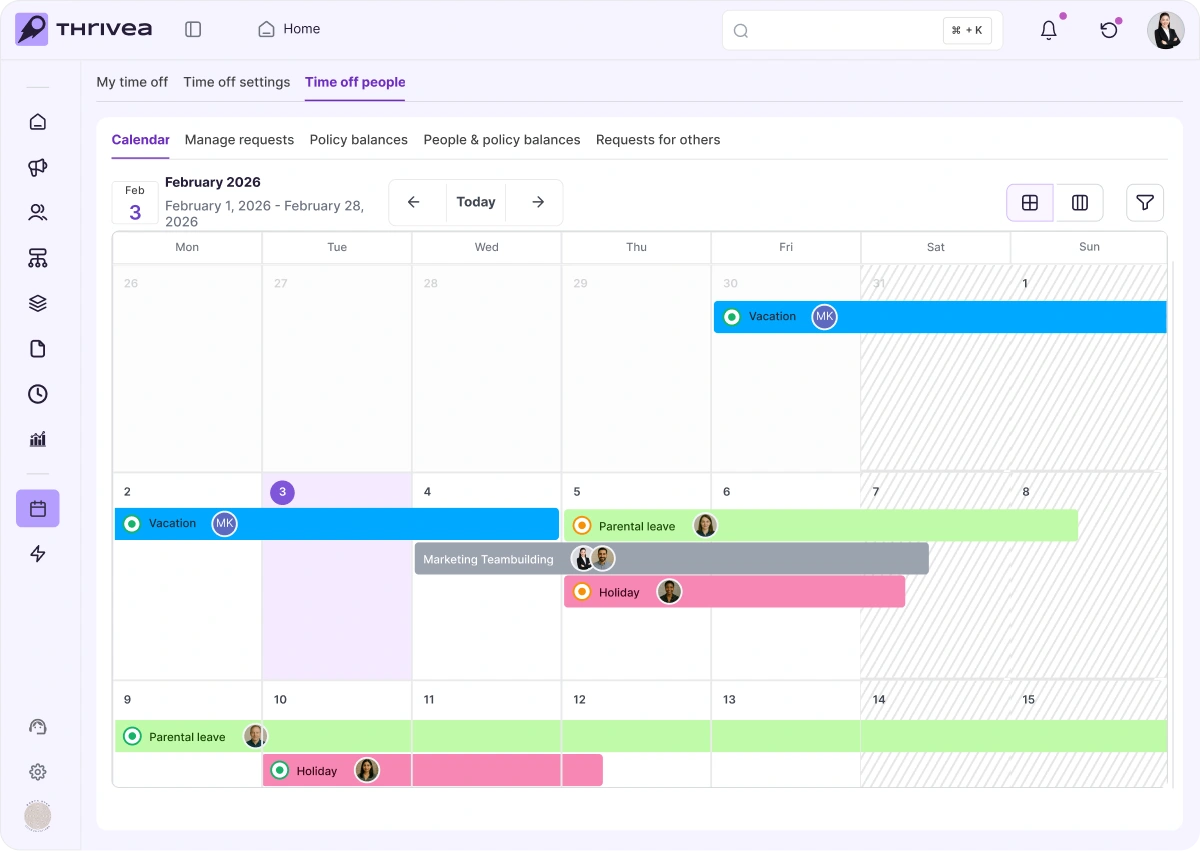 Employees request time off directly in Thrivea. Managers get notified, approve with one click, and balances update automatically.
